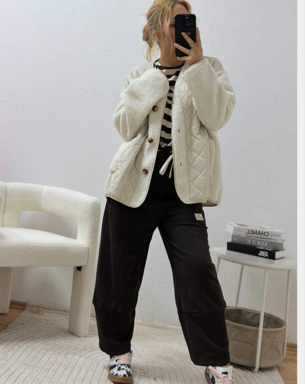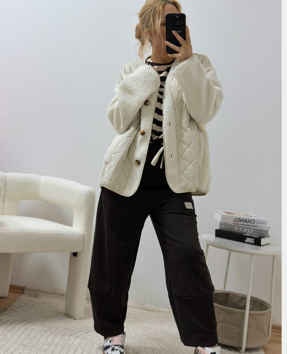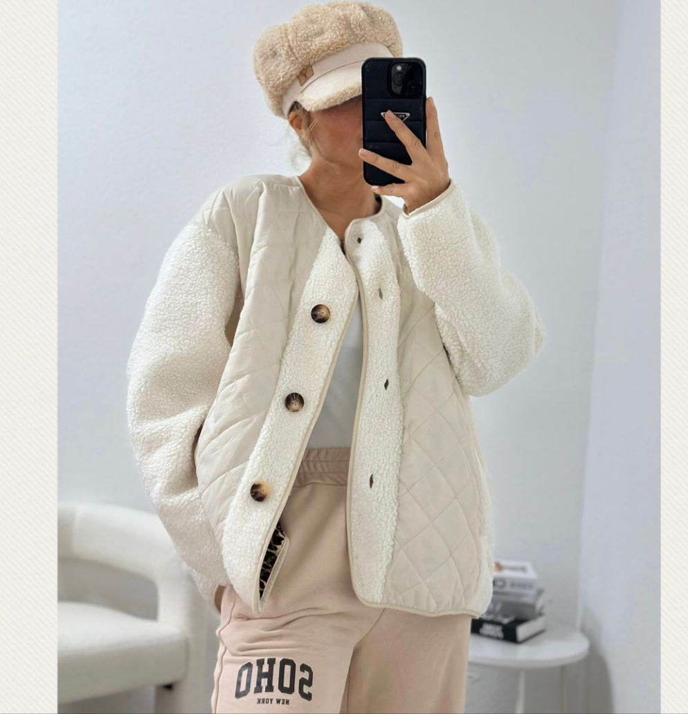 Deze prachtige gewatteerde jas in een elegante crème/witte kleur combineert comfort met elegantie. Het klassieke gewatteerde design met diamantpatroon zorgt voor een tijdloze uitstraling, terwijl de zachte vulling je heerlijk warm houdt op koelere dagen.