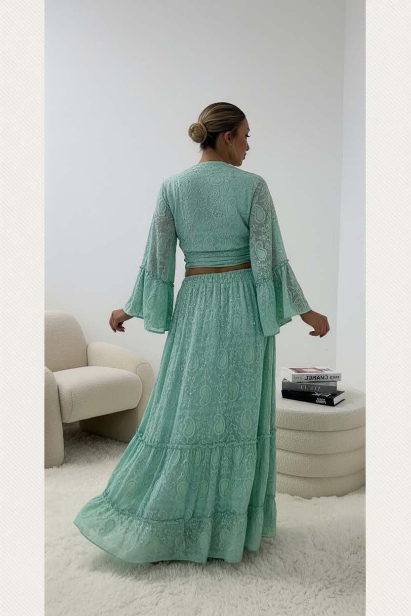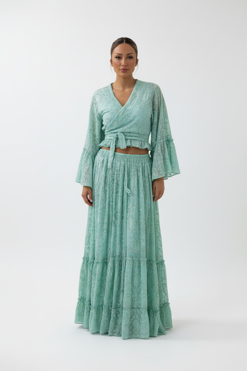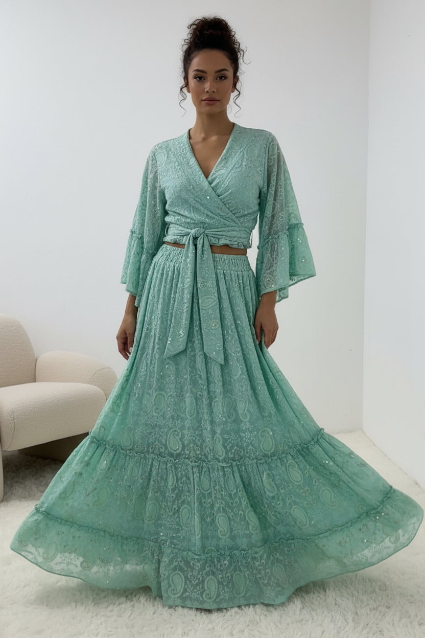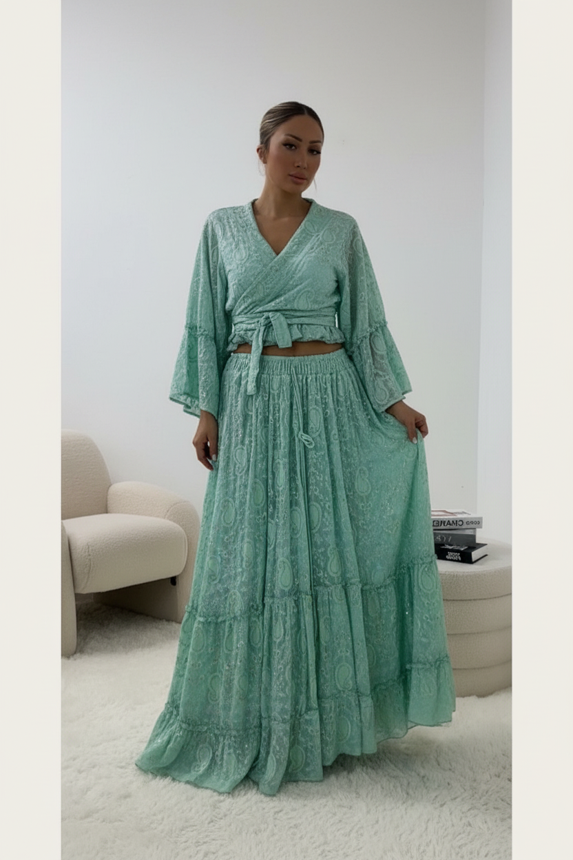 Prachtige mintgroene two-piece set van hoogwaardig katoen met elegante textuur. Deze veelzijdige outfit bestaat uit een wikkel top met strikdetail en een lange, vloeiende maxi rok met laagjes.
