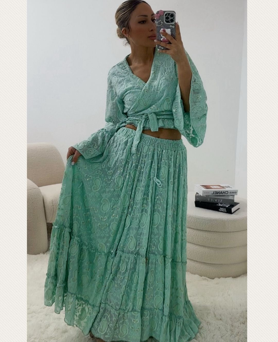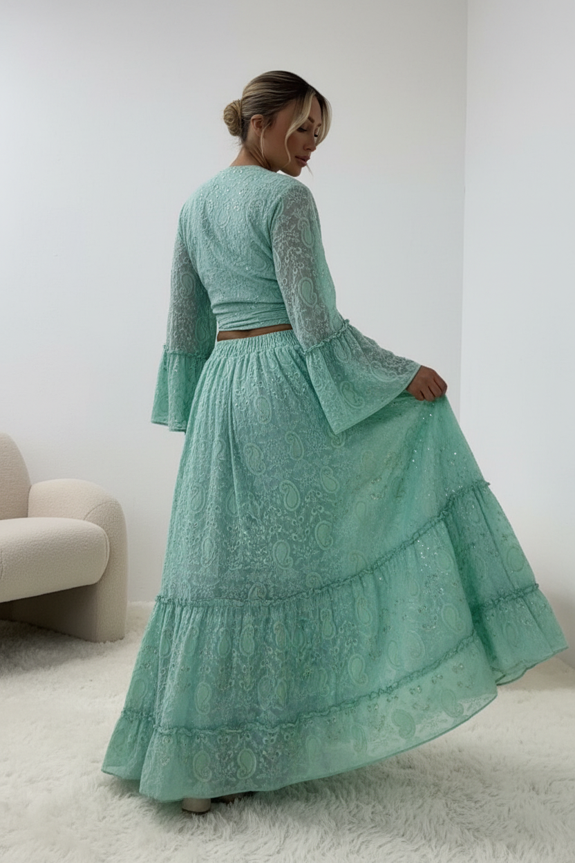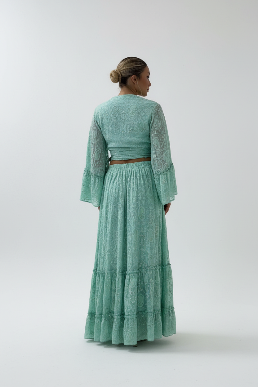 Prachtige mintgroene two-piece set van hoogwaardig katoen met elegante textuur. Deze veelzijdige outfit bestaat uit een wikkel top met strikdetail en een lange, vloeiende maxi rok met laagjes.